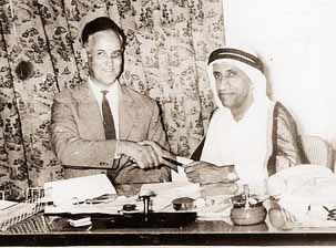 المرحوم احمد سعود الخالد خلال توقيع اول اتفاقية طيران مع مندوب الخطوط البريطانية بين الخطوط الوطنية